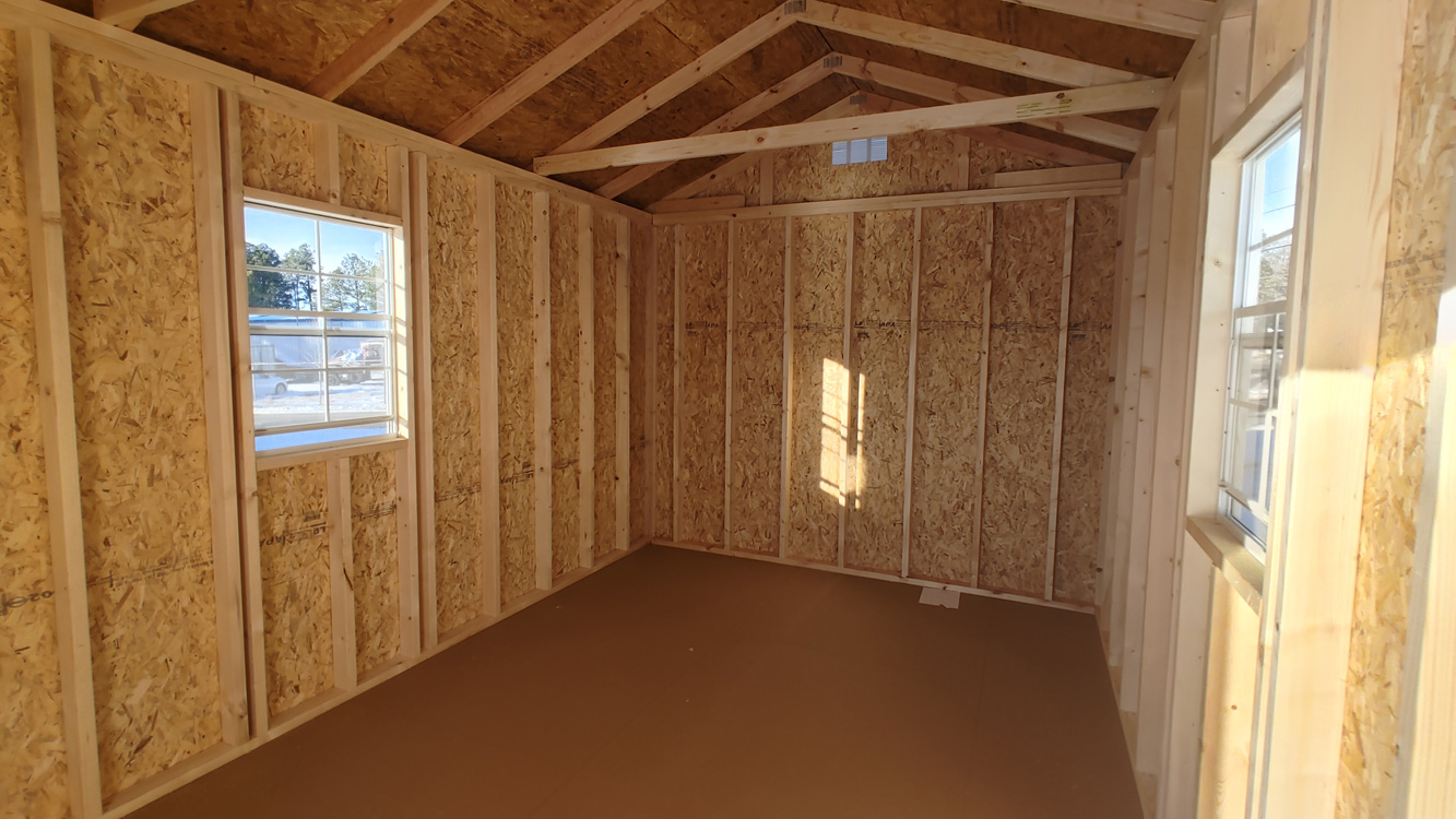 A-frame utility style storage shed with 8' walls, double barn doors, two 2' x 3' windows and 8' walls. The siding is LP Smart Panel zinc borate treated siding and has a 50 year warranty through the siding manufacturer. The building is built with 16" on center studs, 24" on center trusses, 2" x 4" floor joists, double top stud plate, 4" x 6" ground rated pressure treated skids, which are notched for 16" on center floor joists, which are also pressure treated. The floor is painted 5/8" tongue and groove engineered panels. Standard floor options are designed for 40 lb/sq. ft. live load and 200 lb/sq. ft. point load. This building comes with 29 gauge silver metal roof, which has a 30 year limited warranty. The building is finished with Sherwin Williams' Eaglet Beige paint and Barn White trim. The double barn doors comes with a set of two matching keys. Additional options are available on custom ordered buildings. Built by Old Hickory Buildings in Virginia.