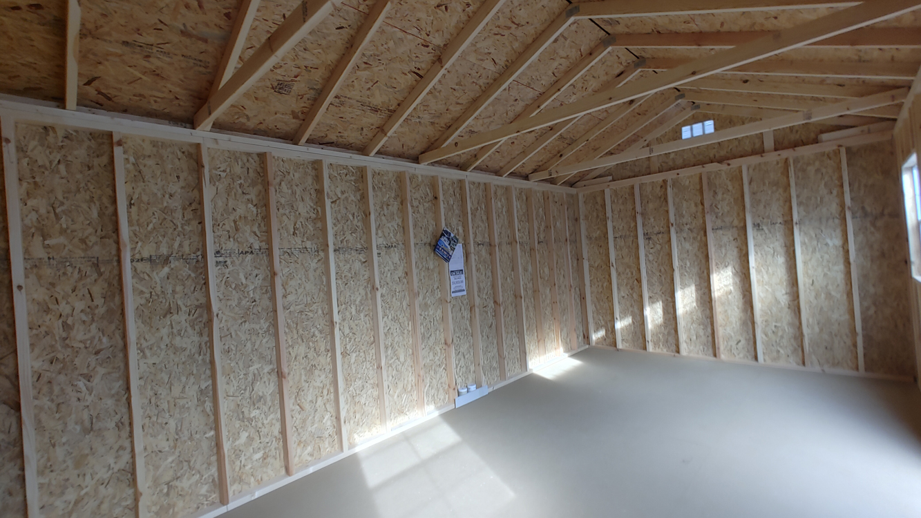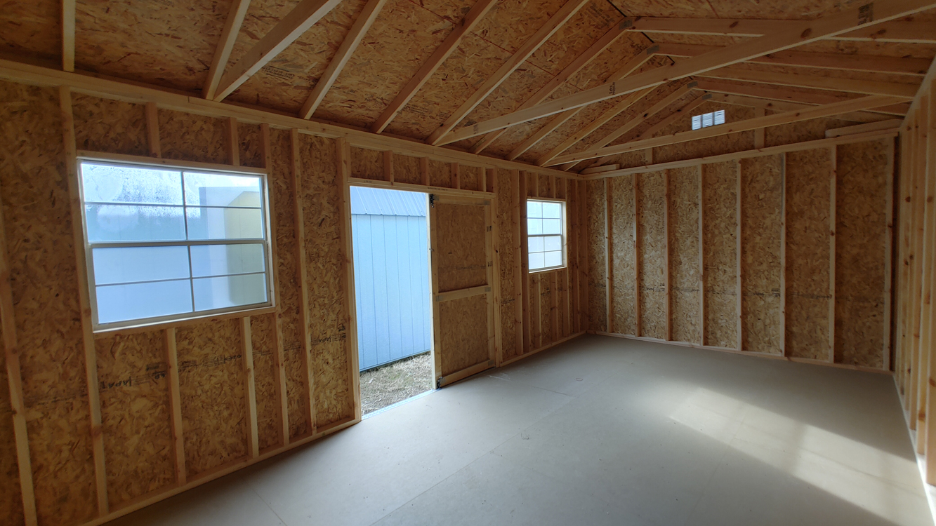 A-frame utility style storage shed with 8' walls, two 3' x 3' single pane window and double barn doors. The shed has double barn doors in the center of the 20' wide side of the building, with one window on each side of the door. The siding is LP Smart Panel zinc borate treated siding and has a 50 year warranty through the siding manufacturer. The building is built with 16" on center studs, 24" on center trusses, double top stud plate, 2" x 4" floor joists, 4" x 6" pressure treated skids, which are notched for 16" on center floor joists, which are also pressure treated. The floor is painted 5/8" tongue and groove engineered panels. Standard floor options are designed for 40 lb/sq. ft. live load and 200 lb/sq. ft. point load. This building comes with 29 gauge burnished slate metal roof, which has a 30 year limited warranty. The building is finished with Sherwin Williams' Crewel Tan paint and Barn White trim. The double barn doors comes with a set of two matching keys. Additional options are available on custom ordered buildings. Built by Old Hickory Buildings in Virginia.