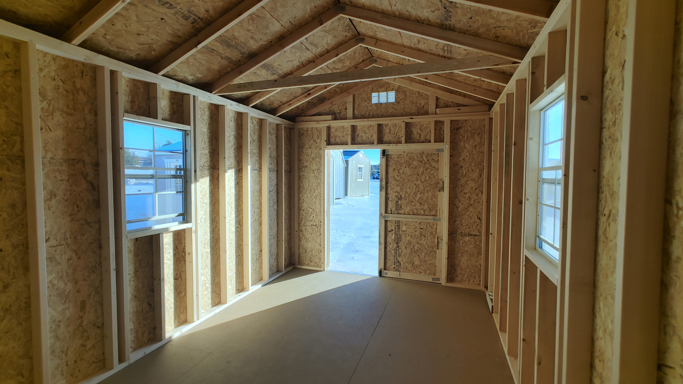 A-frame utility style storage shed with 8' walls, double barn doors, two 2' x 3' windows and 8' walls. The siding is LP Smart Panel zinc borate treated siding and has a 50 year warranty through the siding manufacturer. The building is built with 16" on center studs, 24" on center trusses, 2" x 4" floor joists, double top stud plate, 4" x 6" ground rated pressure treated skids, which are notched for 16" on center floor joists, which are also pressure treated. The floor is painted 5/8" tongue and groove engineered panels. Standard floor options are designed for 40 lb/sq. ft. live load and 200 lb/sq. ft. point load. This building comes with 29 gauge silver metal roof, which has a 30 year limited warranty. The building is finished with Sherwin Williams' Eaglet Beige paint and Barn White trim. The double barn doors comes with a set of two matching keys. Additional options are available on custom ordered buildings. Built by Old Hickory Buildings in Virginia.