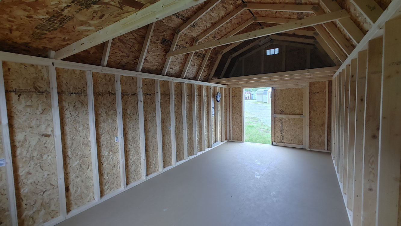Lofted barn style storage shed with 6'3" walls, double barn doors, and one 3' x 3' window. The shed has double barn doors in the center of the 10' wide side of the building, and the 3' x 3' window on the opposite 10' wide wall, with a 4' loft overhead storage in both the front and back of the building. The siding is LP Smart Panel zinc borate treated siding and has a 50 year warranty through the siding manufacturer. The building is built with 16" on center studs, 24" on center trusses, double top stud plate, 2" x 4" floor joists, 4" x 6" pressure treated skids, which are notched for 16" on center floor joists, which are also pressure treated. The floor is painted 5/8" tongue and groove engineered panels. Standard floor options are designed for 40 lb/sq. ft. live load and 200 lb/sq. ft. point load. This building comes with 29 gauge charcoal metal roof, which has a 30 year limited warranty. The building is finished with Sherwin Williams' Smokey Blue paint and barn white trim. The double barn doors comes with a set of two matching keys. Additional options are available on custom ordered buildings. Built by Old Hickory Buildings in Virginia.