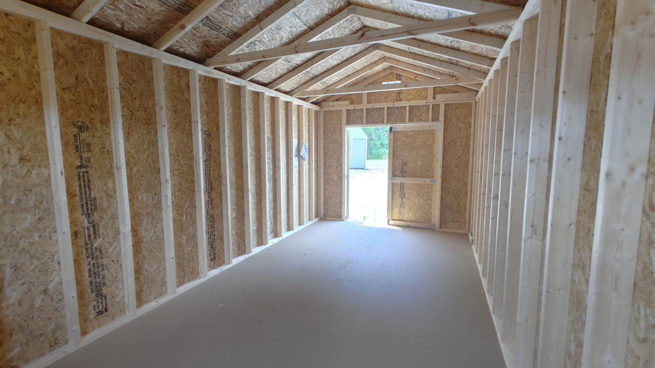A-frame side utility style storage shed with 8' walls, double barn doors, and one 3 x 3' window. The siding is LP Smart Panel zinc borate treated siding and has a 50 year warranty through the siding manufacturer. The building is built with 16" on center studs, 24" on center trusses, double top stud plate, 2" x 4" floor joists, 4" x 6" pressure treated skids, which are notched for 16" on center floor joists, which are also pressure treated. The floor is painted 5/8" tongue and groove engineered panels. Standard floor options are designed for 40 lb/sq. ft. live load and 200 lb/sq. ft. This building comes with 29 gauge charcoal metal roof, which has a 30 year limited warranty. The building is finished with Sherwin Williams' Crewel Tan paint and barn white trim. The double barn doors comes with a set of two matching keys. Additional options are available on custom ordered buildings. Engineer certified for 30 psf ground snow load and 105 mph winds. Built by Old Hickory Buildings in Virginia.