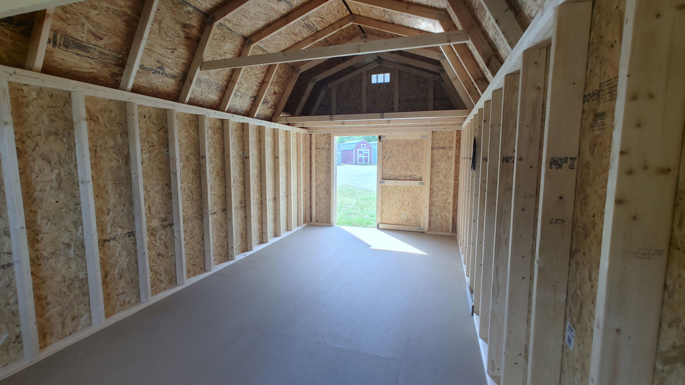 Lofted barn style storage shed with 6'3" walls, double barn doors, and one 3' x 3' window. The shed has double barn doors in the center of the 10' wide side of the building, and the 3' x 3' window on the opposite 10' wide wall, with a 4' loft overhead storage in both the front and back of the building. The siding is LP Smart Panel zinc borate treated siding and has a 50 year warranty through the siding manufacturer. The building is built with 16" on center studs, 24" on center trusses, double top stud plate, 2" x 4" floor joists, two 4" x 6" pressure treated skids, which are notched for 16" on center floor joists, which are also pressure treated. The floor is painted 5/8" tongue and groove engineered panels. Standard floor options are designed for 40 lb/sq. ft. live load and 200 lb/sq. ft. point load. This building comes with 29 gauge charcoal metal roof, which has a 30 year limited warranty. The building is finished with Sherwin Williams' Thatch Brown paint and barn white trim. The double barn doors comes with a set of two matching keys. Additional options are available on custom ordered buildings. Built by Old Hickory Buildings in Virginia.