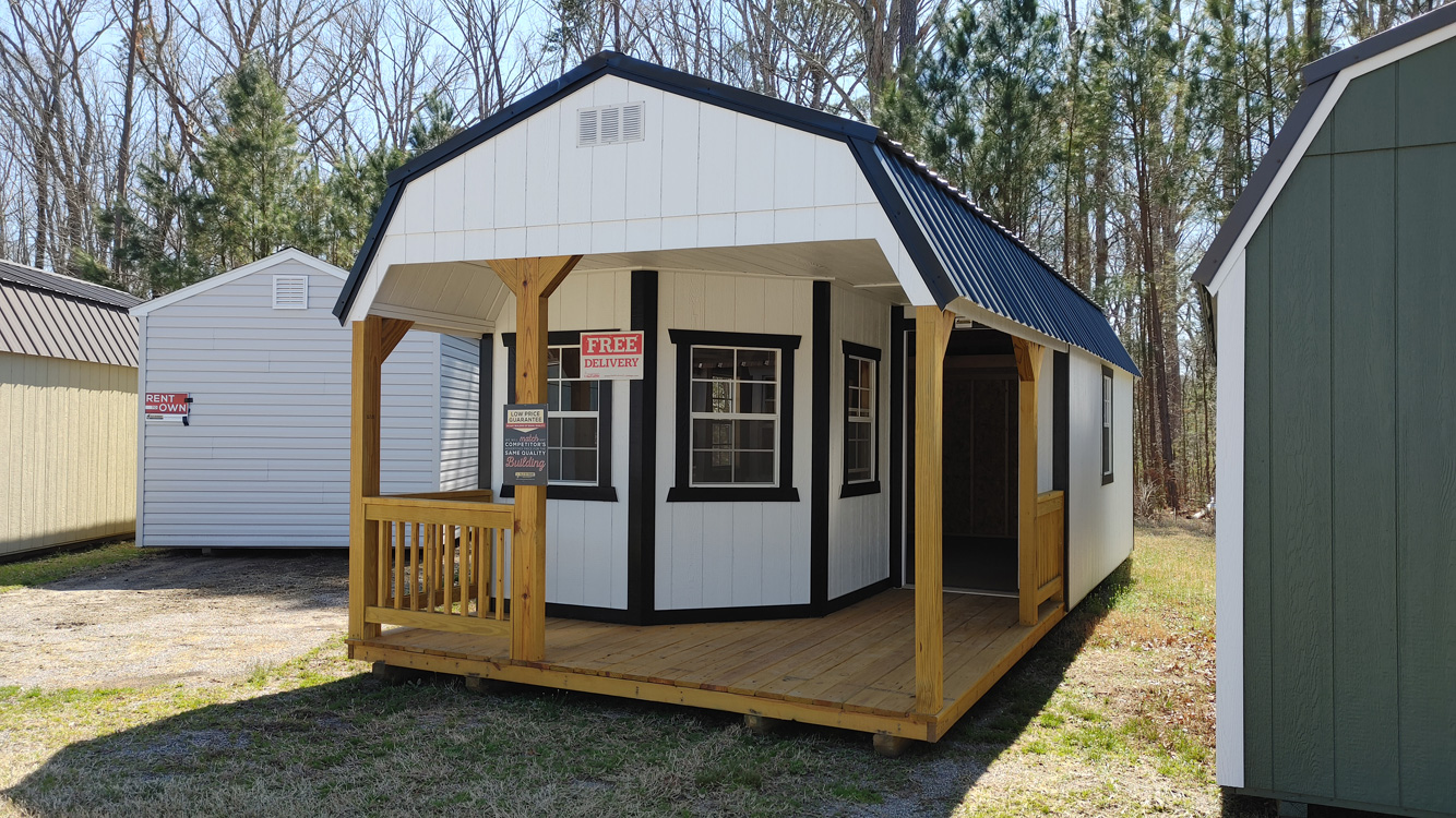 Lofted style storage shed with 6'3" walls, and deluxe playhouse package, including porch, walk in 9-lite door, and 5 windows, as well as 4' overhead loft storage. The siding is LP Smart Panel zinc borate treated siding and has a 50 year warranty through the siding manufacturer. The building is built with 16" on center studs, 24" on center trusses, double top stud plate, 2" x 4" floor joists, 4" x 6" pressure treated skids, which are notched for 12" on center floor joists, which are also pressure treated. The floor is painted 5/8" tongue and groove engineered panels. Standard floor options are designed for 40 lb/sq. ft. live load and 200 lb/sq. ft. point load. This building comes with 29 gauge black metal roof, which has a 30 year limited warranty. The building is finished with Sherwin Williams' Barn White paint and Barn White trim. The walk in door comes with a set of two matching keys. Additional options are available on custom ordered buildings. Built by Old Hickory Buildings in Virginia.