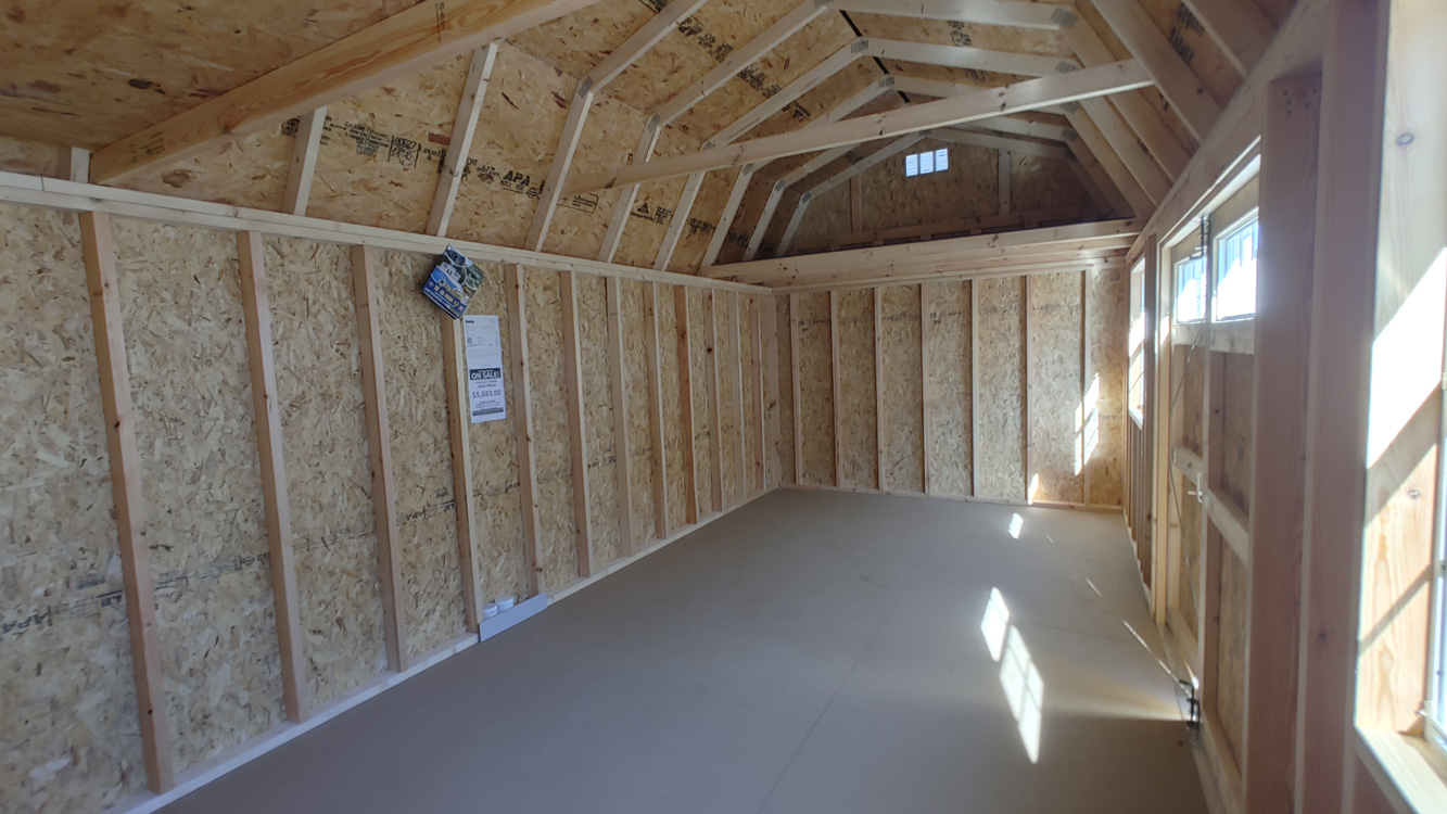 Lofted barn style storage shed with 6'3" walls, double barn doors, two 3' x 3' windows. The shed has double barn doors in the center of the 20' wide side of the building, with one window on each side of the doors. The siding is LP Smart Panel zinc borate treated siding and has a 50 year warranty through the siding manufacturer. The building is built with 16" on center studs, 24" on center trusses, double top stud plate, 2" x 4" floor joists, 4" x 6" pressure treated skids, which are notched for 16" on center floor joists, which are also pressure treated. The floor is painted 5/8" tongue and groove engineered panels. Standard floor options are designed for 40 lb/sq. ft. live load and 200 lb/sq. ft. point load. This building comes with 29 gauge silver metal roof, which has a 30 year limited warranty. The building is finished with Sherwin Williams' Eaglet Beige paint and Barn White trim. The double barn doors comes with a set of two matching keys. Additional options are available on custom ordered buildings. Built by Old Hickory Buildings in Virginia.