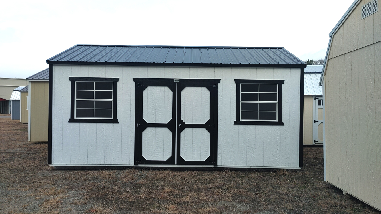 A-frame utility style storage shed with 8' walls, two 3' x 3' single pane window and double barn doors. The shed has double barn doors in the center of the 20' wide side of the building, with one window on each side of the door. The siding is LP Smart Panel zinc borate treated siding and has a 50 year warranty through the siding manufacturer. The building is built with 16" on center studs, 24" on center trusses, double top stud plate, 2" x 4" floor joists, 4" x 6" pressure treated skids, which are notched for 16" on center floor joists, which are also pressure treated. The floor is painted 5/8" tongue and groove engineered panels. Standard floor options are designed for 40 lb/sq. ft. live load and 200 lb/sq. ft. point load. This building comes with 29 gauge black metal roof, which has a 30 year limited warranty. The building is finished with Sherwin Williams' Barn White paint and Tricorn Black trim. The double barn doors comes with a set of two matching keys. Additional options are available on custom ordered buildings. Built by Old Hickory Buildings in Virginia.